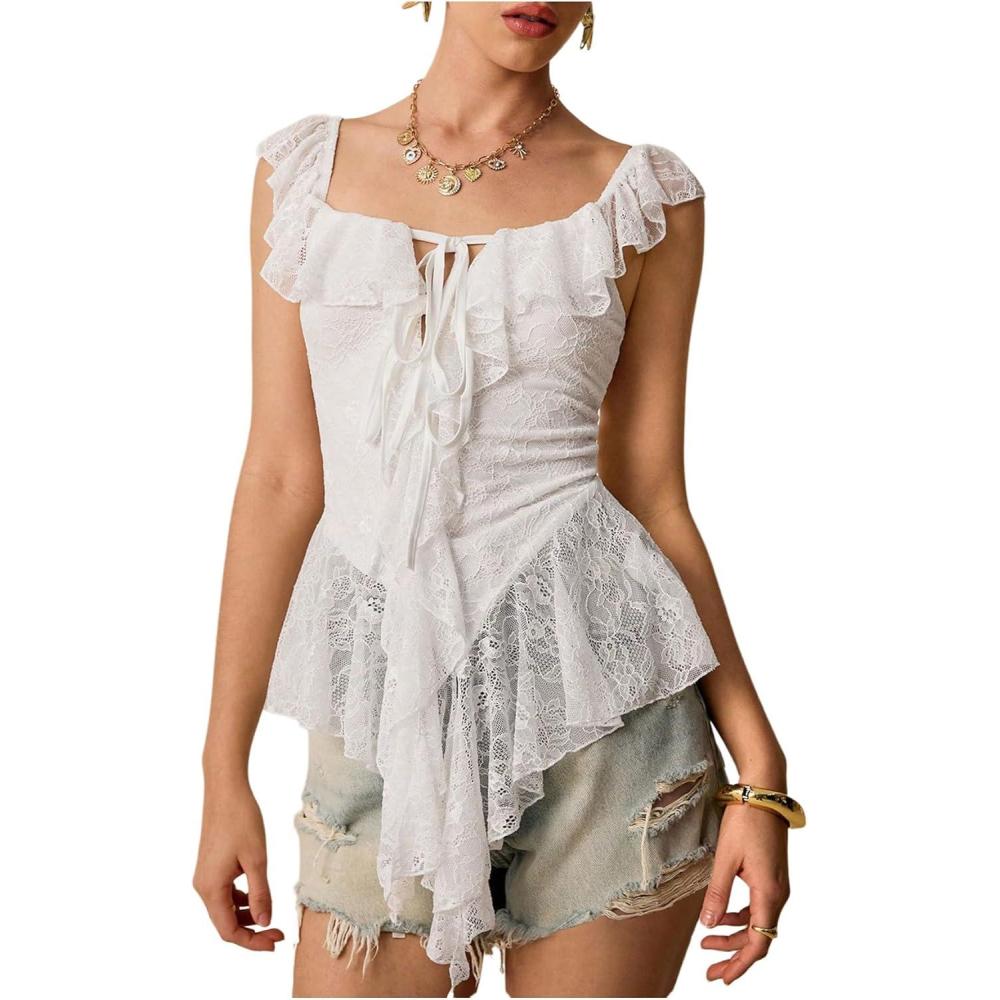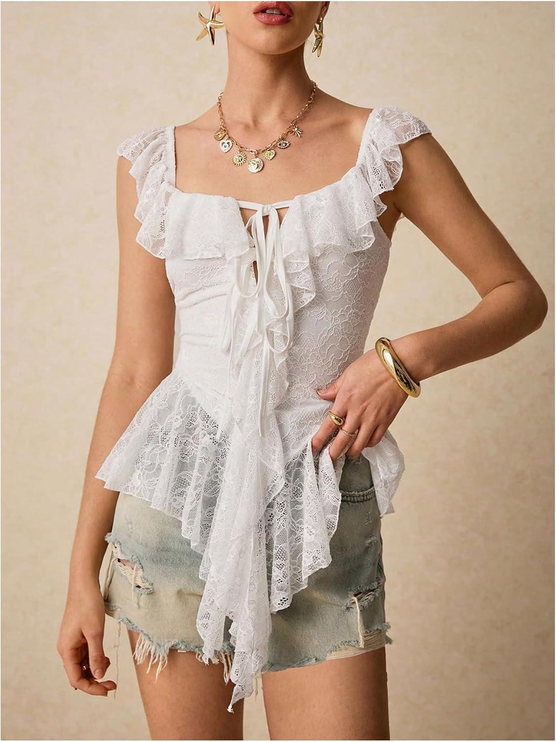 MakeMeChic Women’s Y2k Floral Lace Ruffle Tops Tie Front Peplum Shirt Blouse Festival Rave Top Cowboy Chic(White)