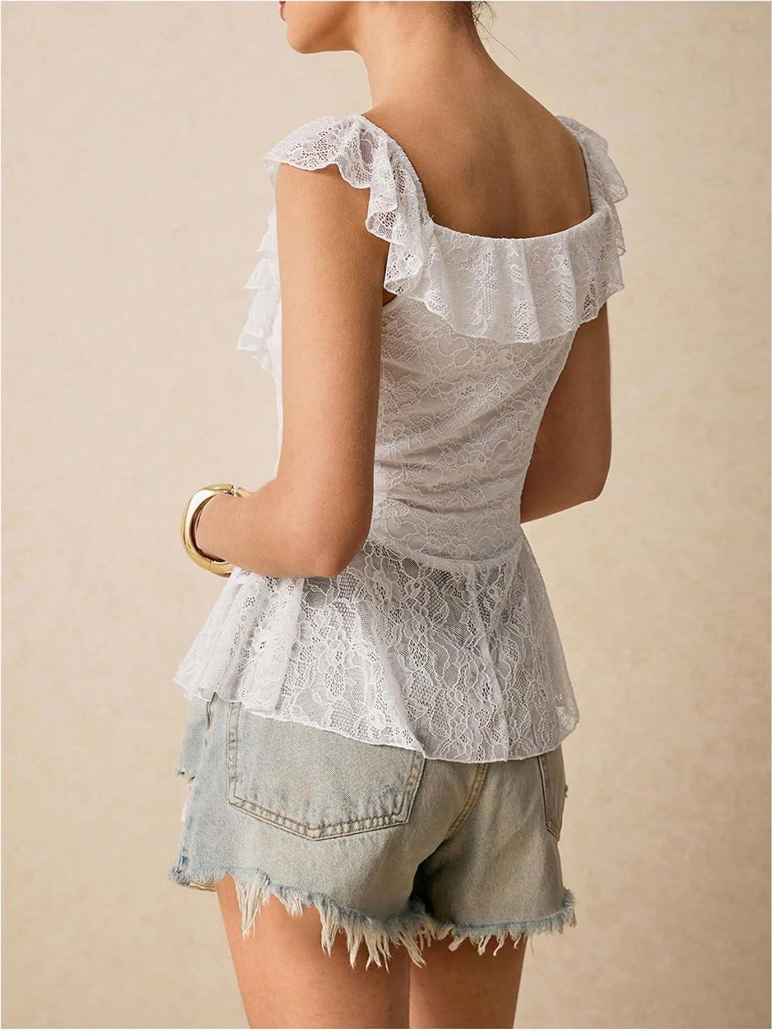MakeMeChic Women's Y2k Floral Lace Ruffle Tops Tie Front Peplum Shirt Blouse Festival Rave Top Cowboy Chic(White)