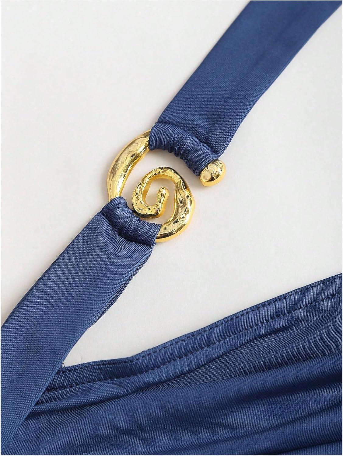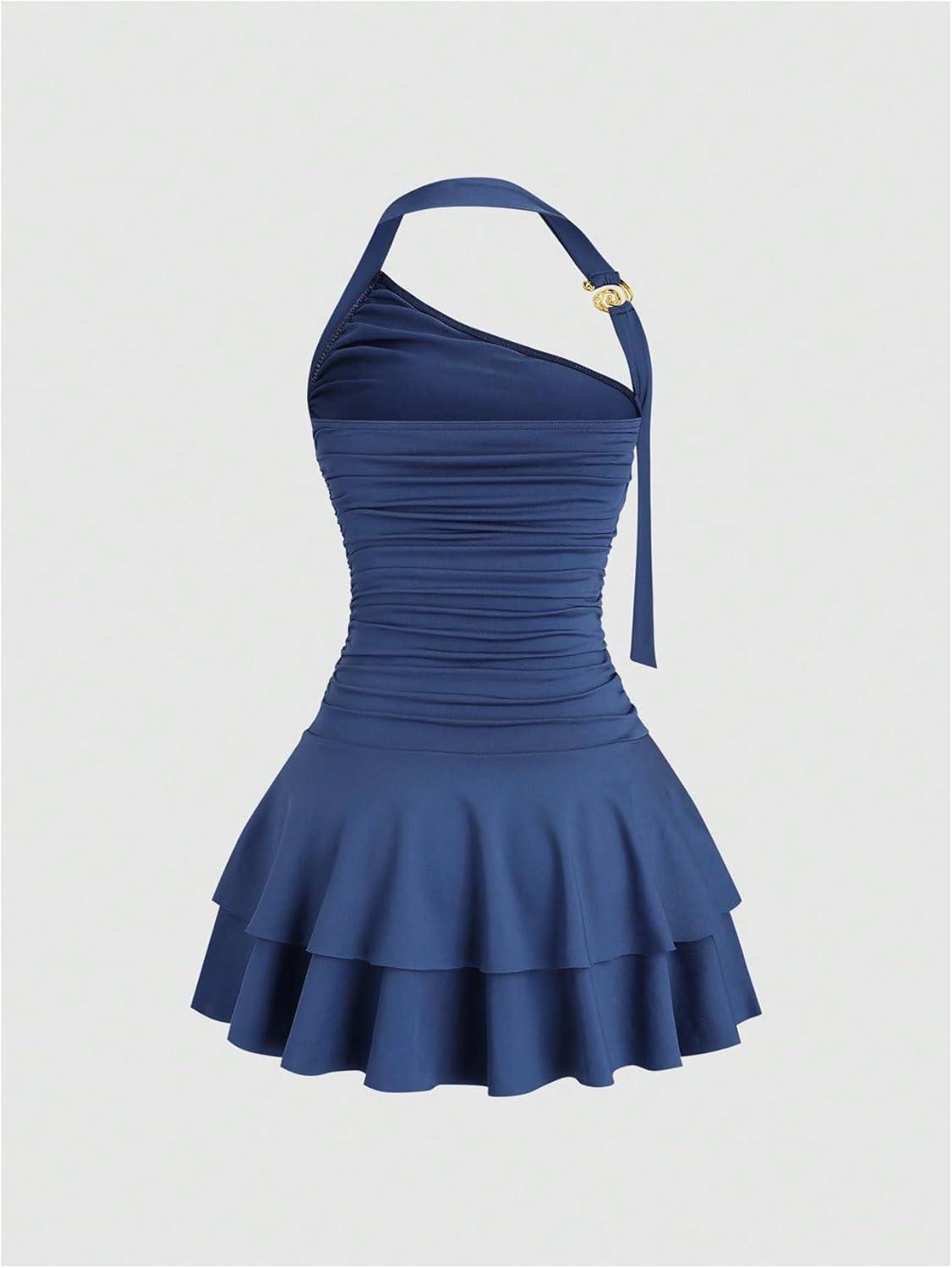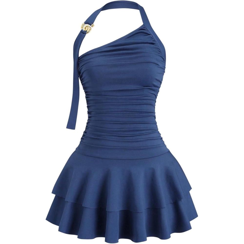 MakeMeChic Women’s Y2k Halter Mini Dress Backless Ruffle Short Going Out Dress(Blue)