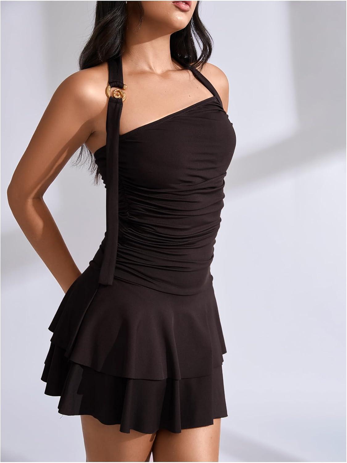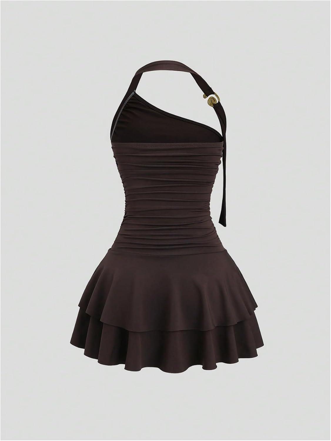 MakeMeChic Women's Y2k Halter Mini Dress Backless Ruffle Short Going Out Dress(Coffee Brown)