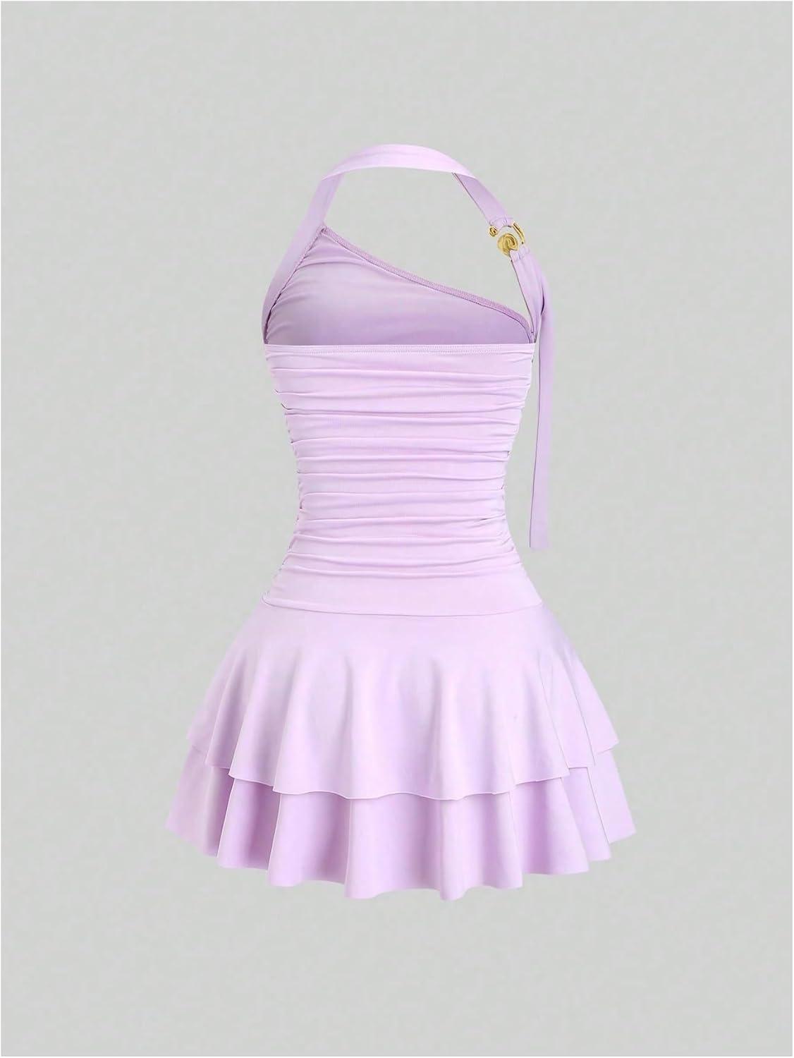 MakeMeChic Women’s Y2k Halter Mini Dress Backless Ruffle Short Going Out Dress(Lilac Purple)
