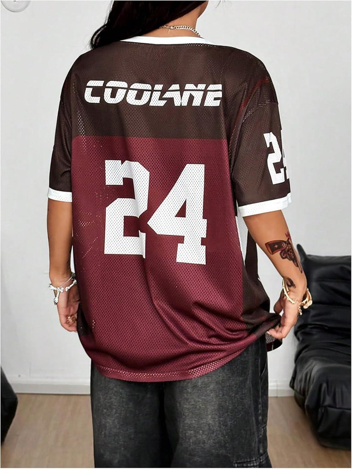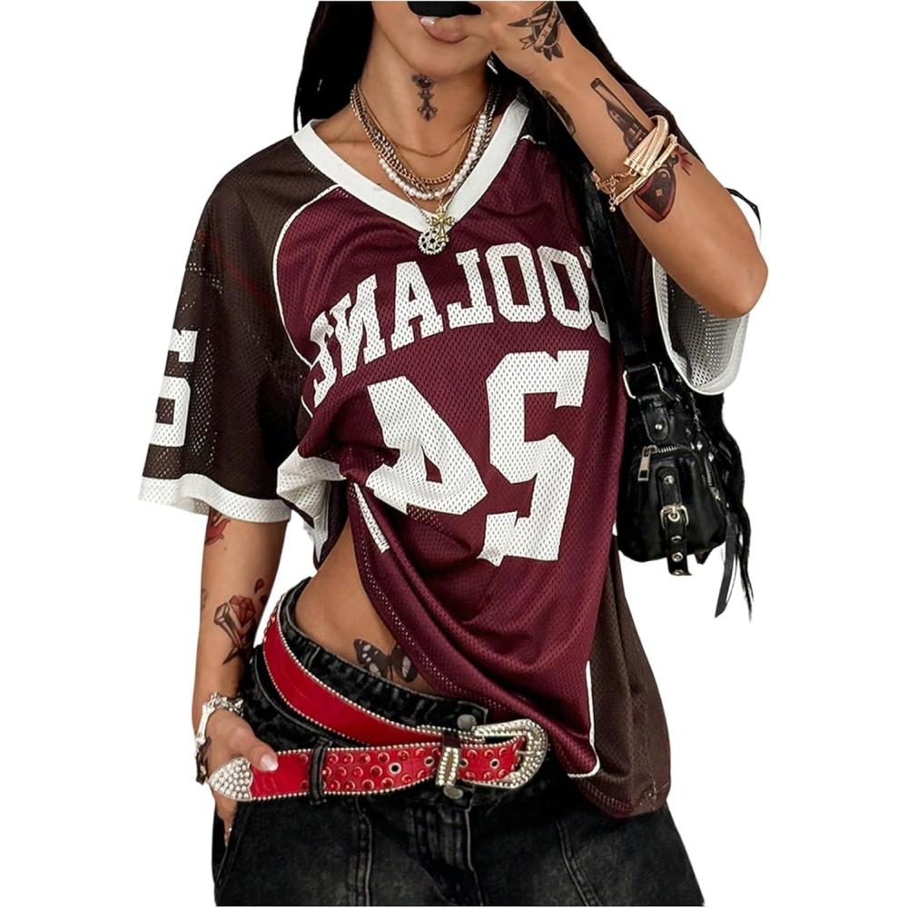 MakeMeChic Women’s Y2k Mesh Jersey Oversized Shirt Graphic Tee Half Sleeve V Neck Streetwear Summer Tops(Burgundy)