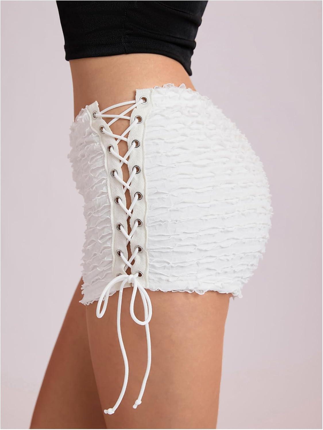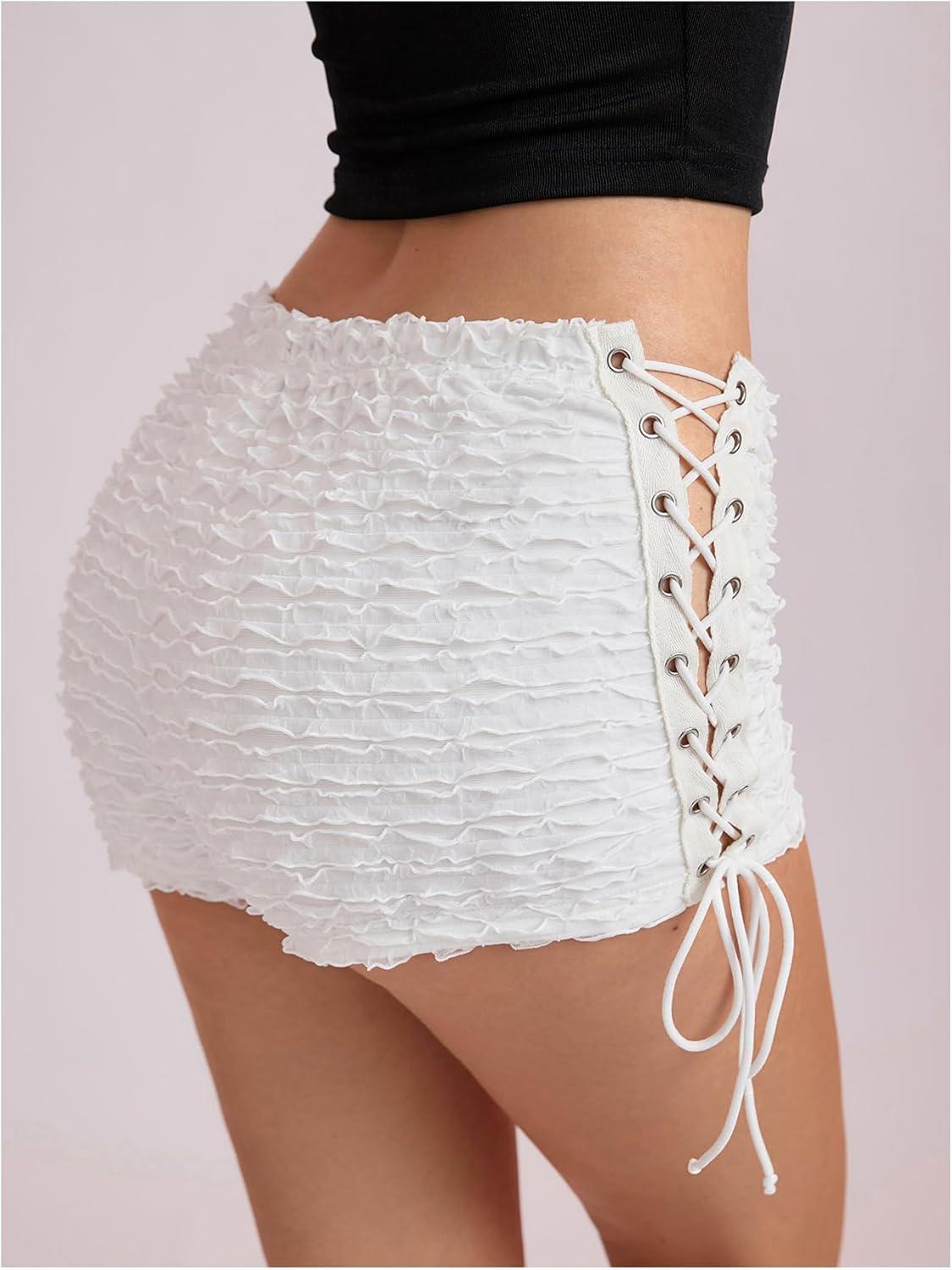 MakeMeChic Women’s Y2K Ruffle Lace Up Micro Shorts Low Rise Rave Party Mini Shorts(White)