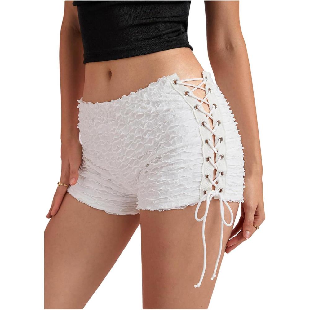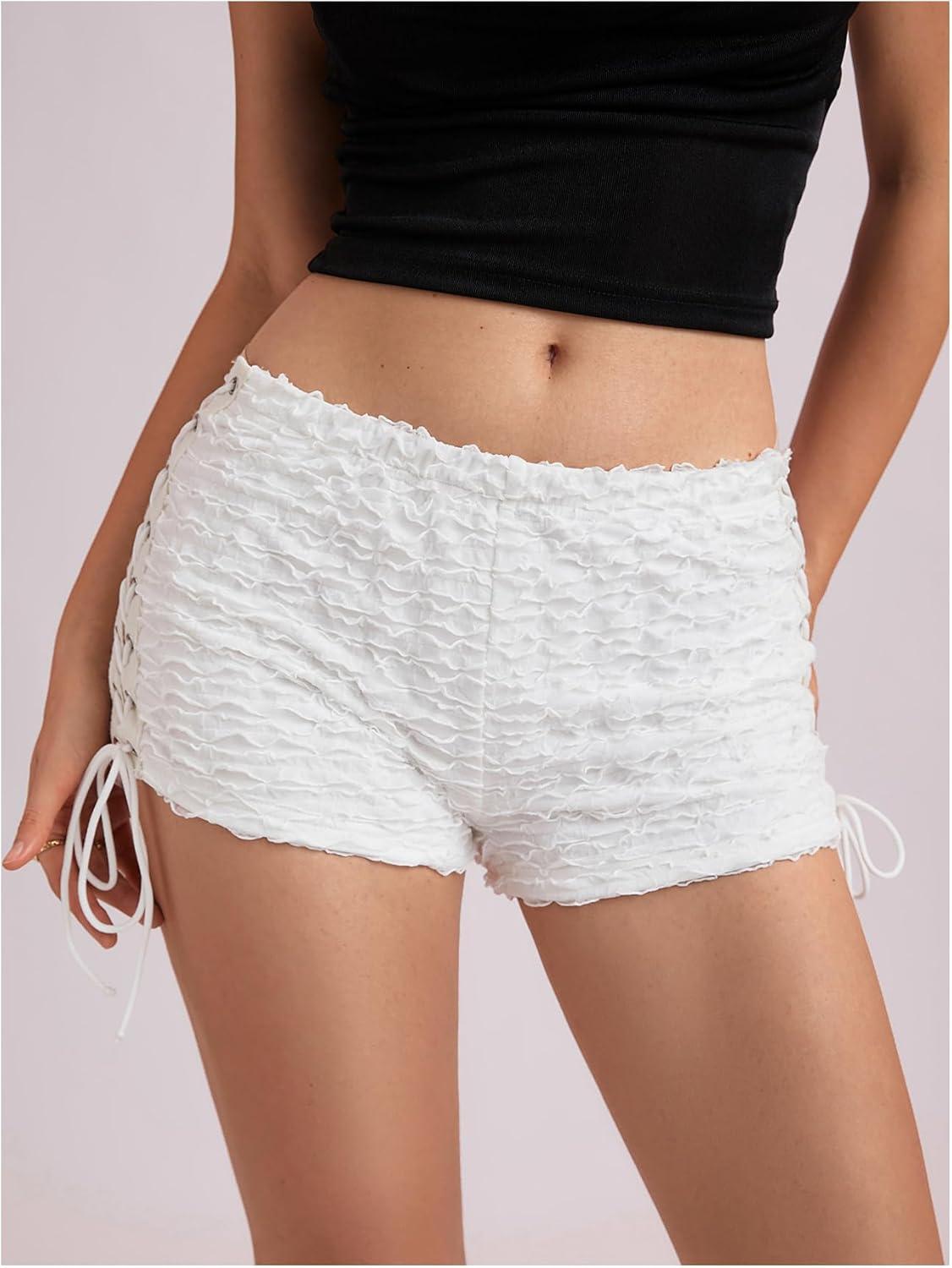 MakeMeChic Women's Y2K Ruffle Lace Up Micro Shorts Low Rise Rave Party Mini Shorts(White)