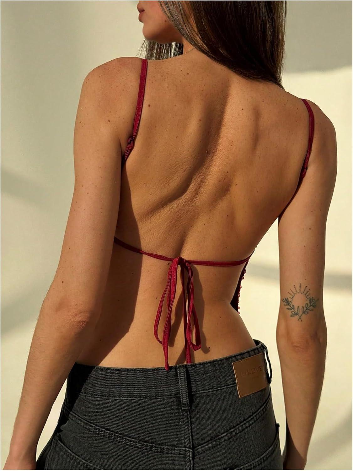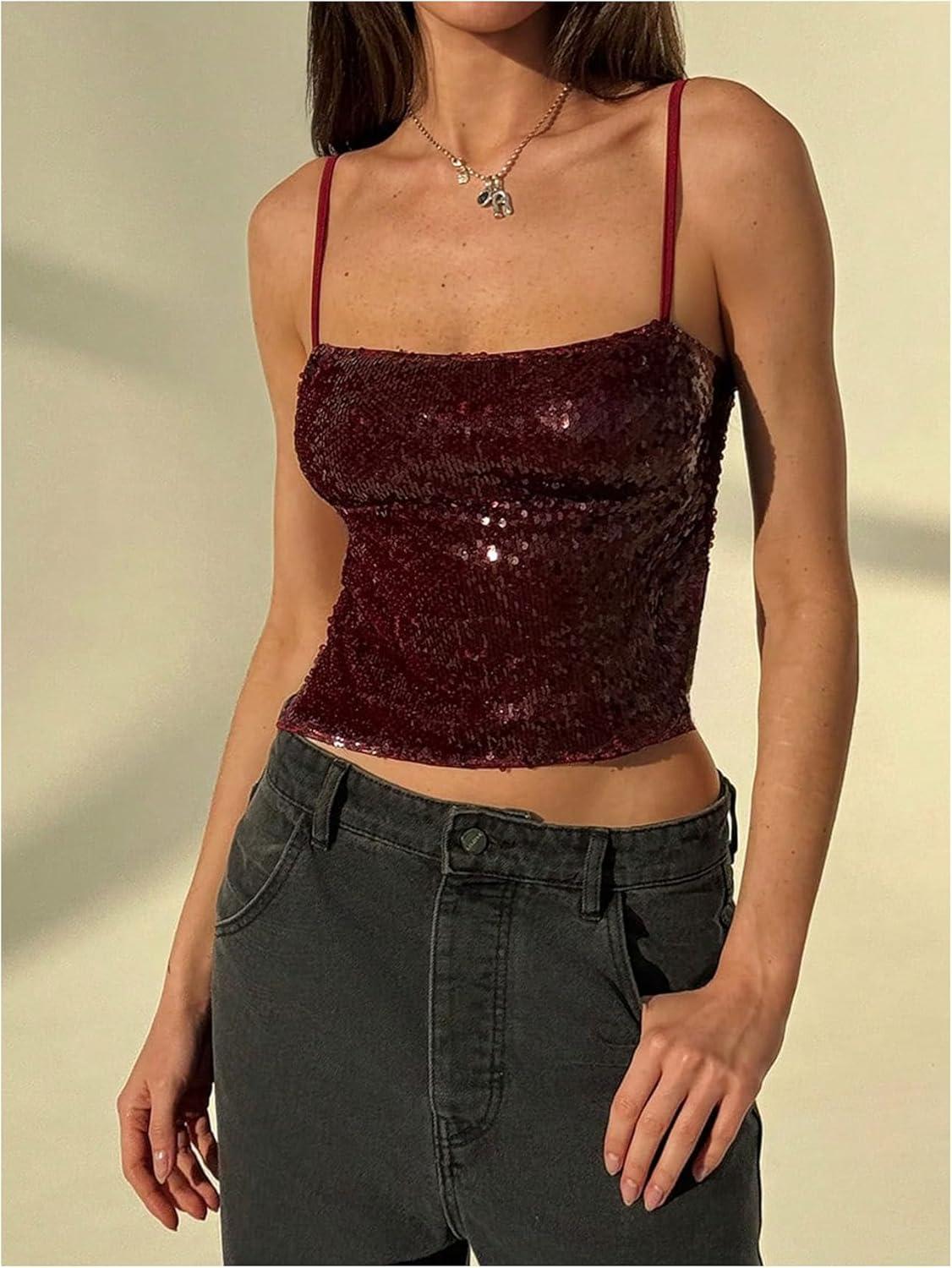 MakeMeChic Women's Y2K Sequin Tops Sparkly Beaded Top Glitter Concert Outfits Party Open Back Dressy Crop Tank Tops(Burgundy)