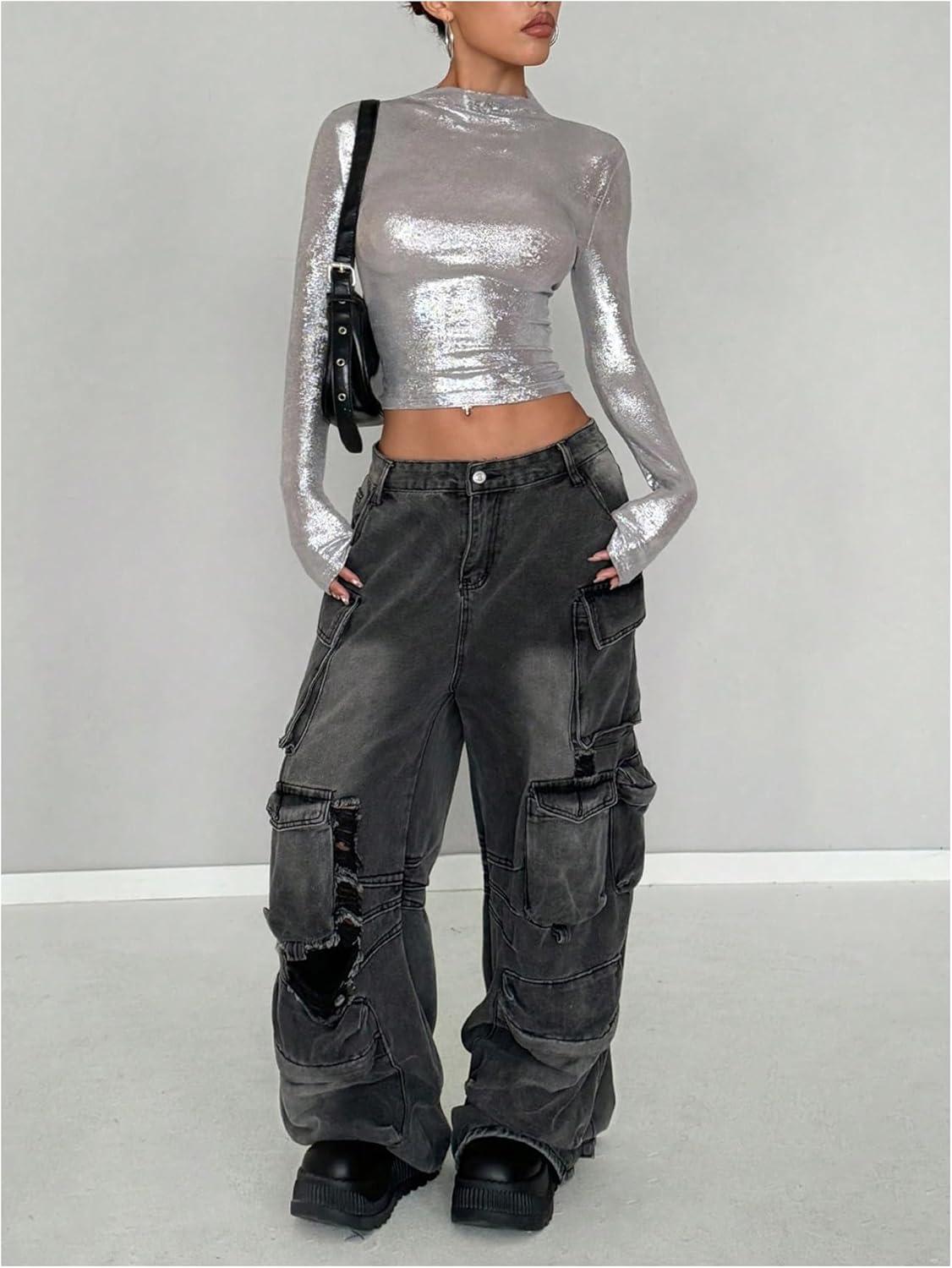 MakeMeChic Women’s Y2K Tops Country Concert Metallic Tee Shirts Long Sleeve Party Going Out Crop Tops(Silver)