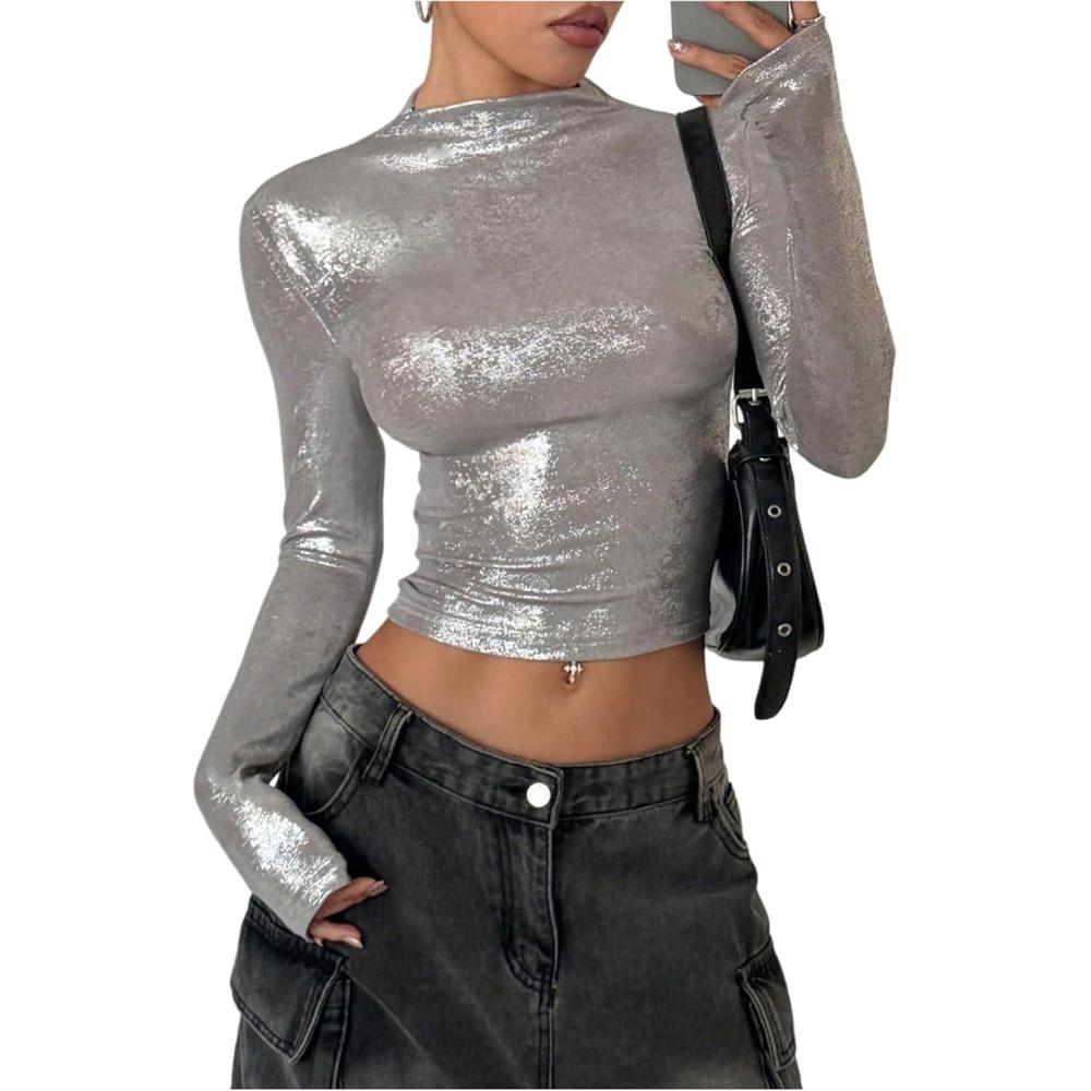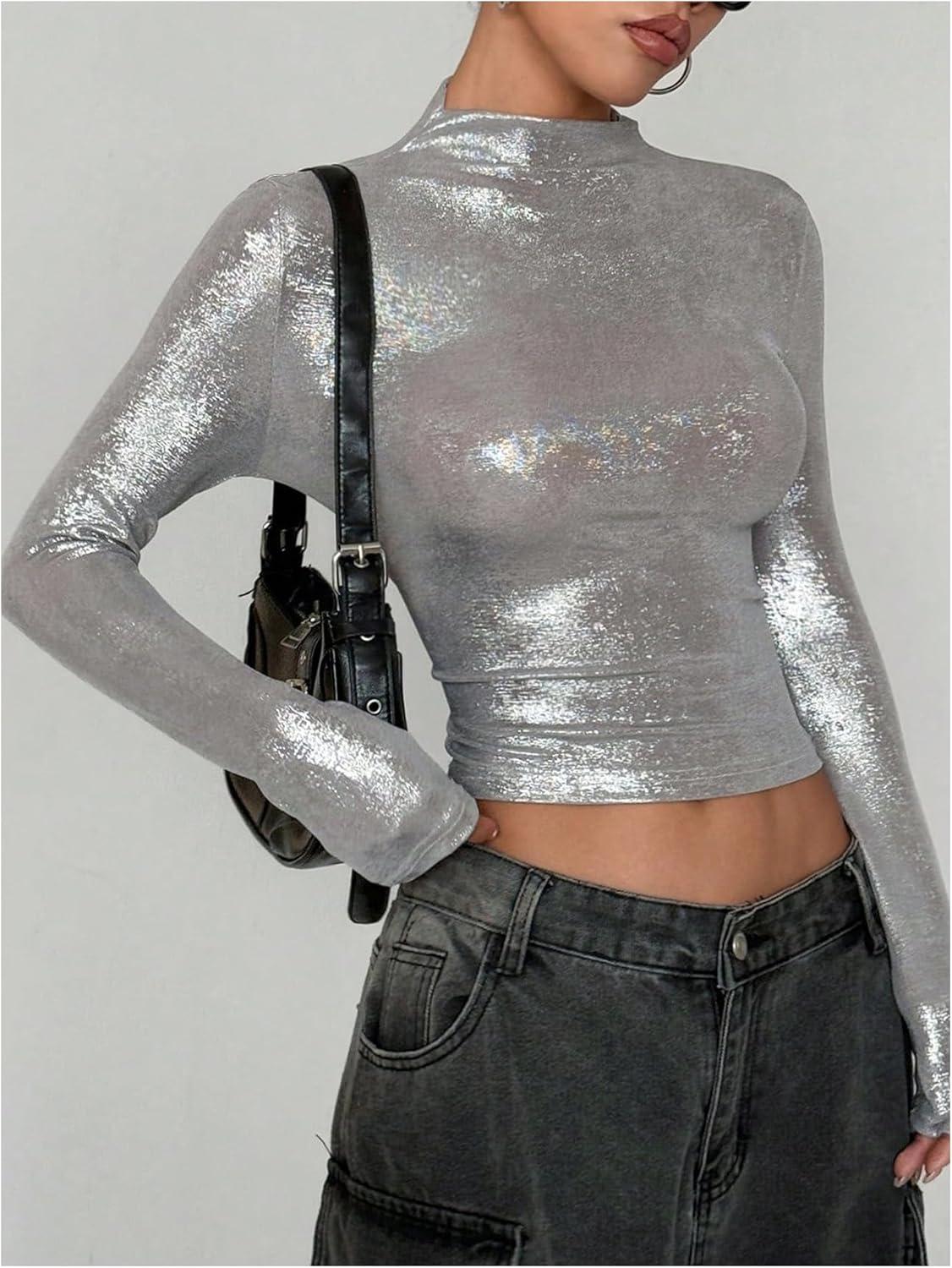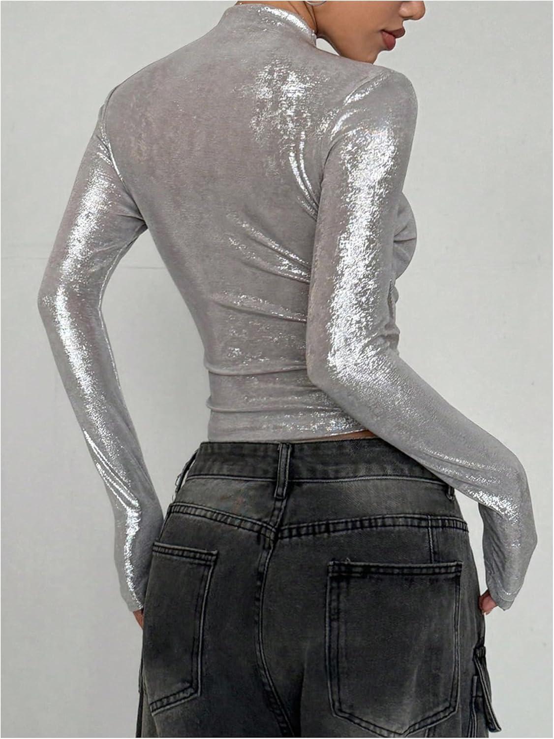 MakeMeChic Women's Y2K Tops Country Concert Metallic Tee Shirts Long Sleeve Party Going Out Crop Tops(Silver)