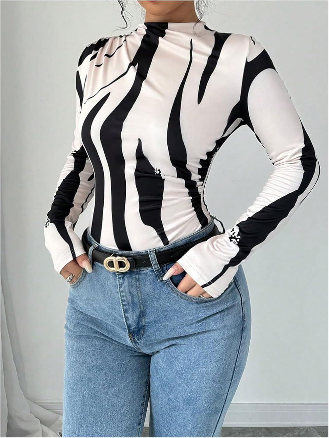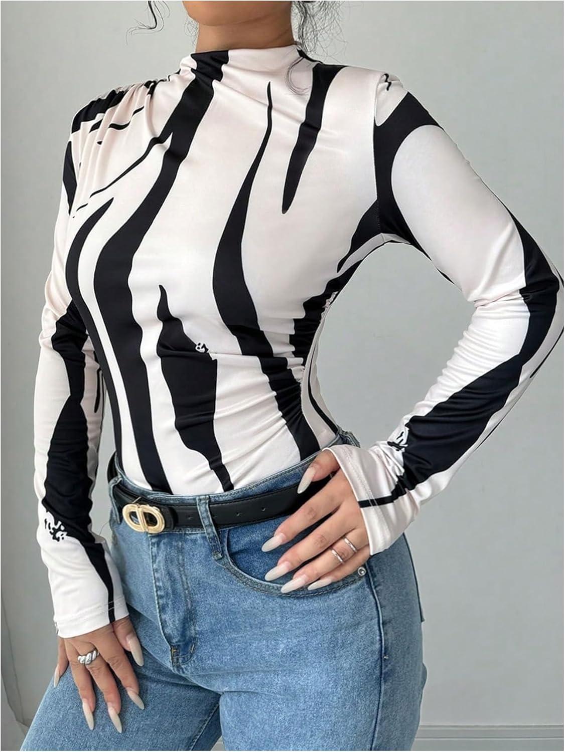 MakeMeChic Women’s Zebra Striped Print Mock Neck Long Sleeve Slim Fit Tee Shirt Tops(Multicolor)
