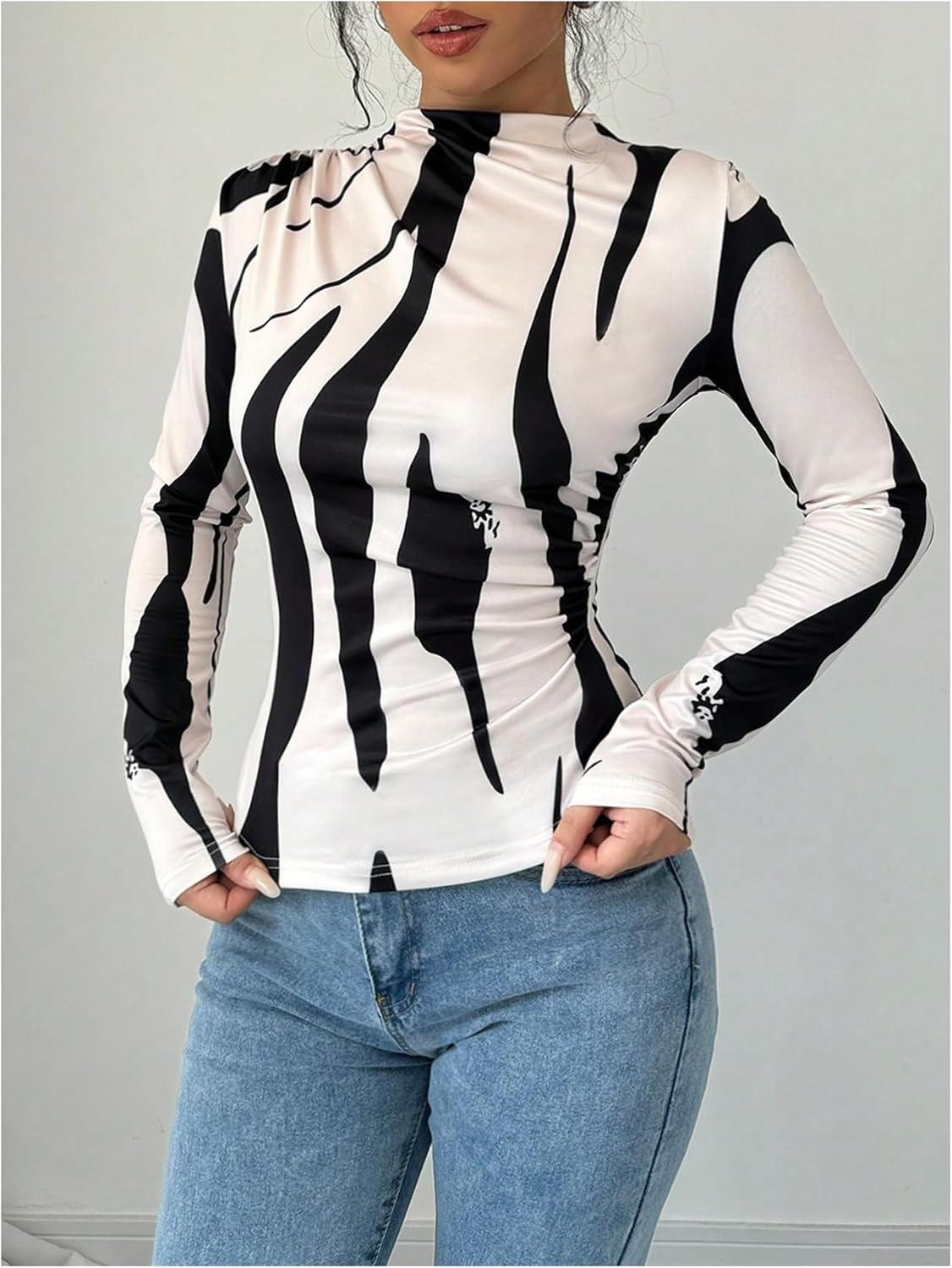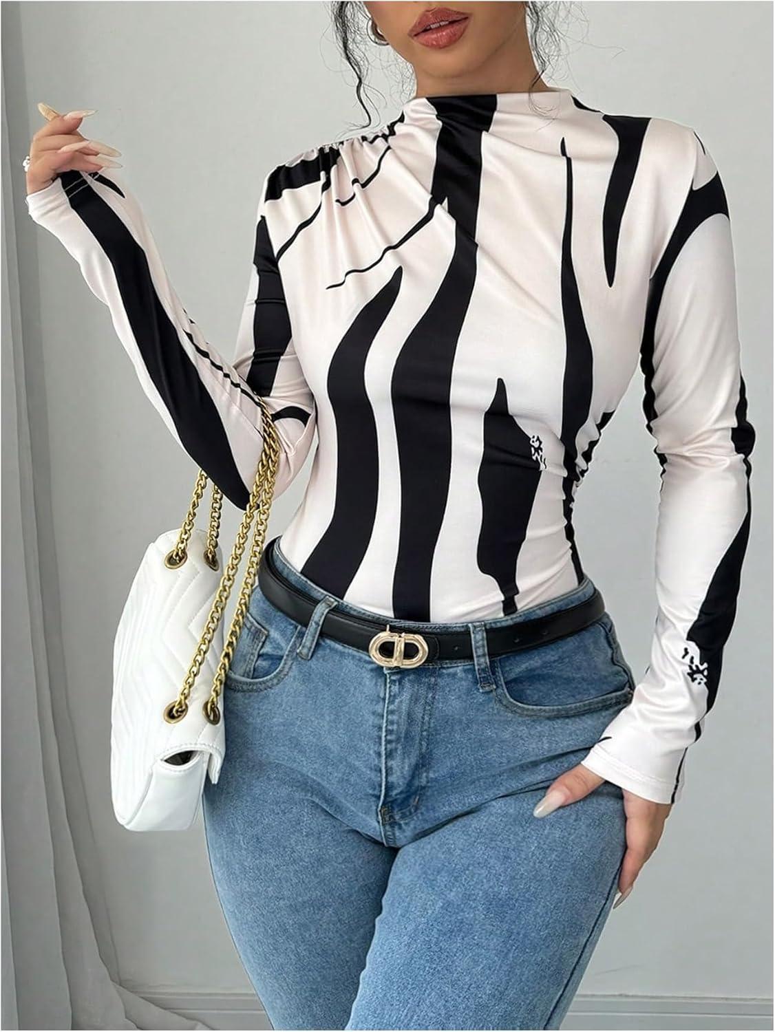 MakeMeChic Women's Zebra Striped Print Mock Neck Long Sleeve Slim Fit Tee Shirt Tops(Multicolor)